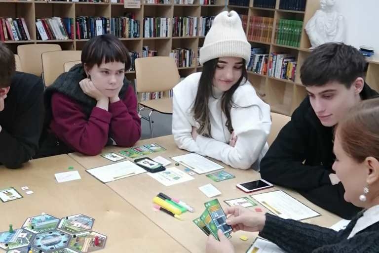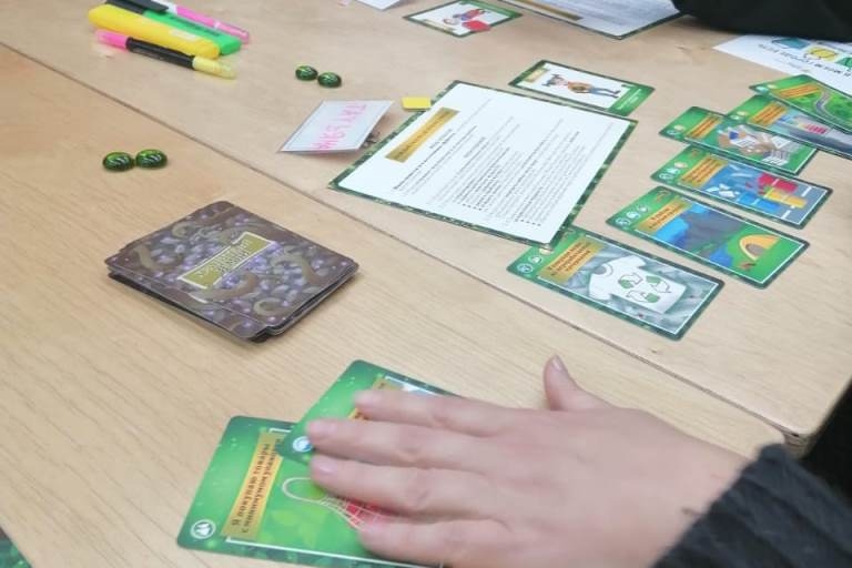 Задача игроков состояла в том, чтобы своими карточками, на которых обозначены экологичные привычки, перекрывать события, ведущие к экологической катастрофе.