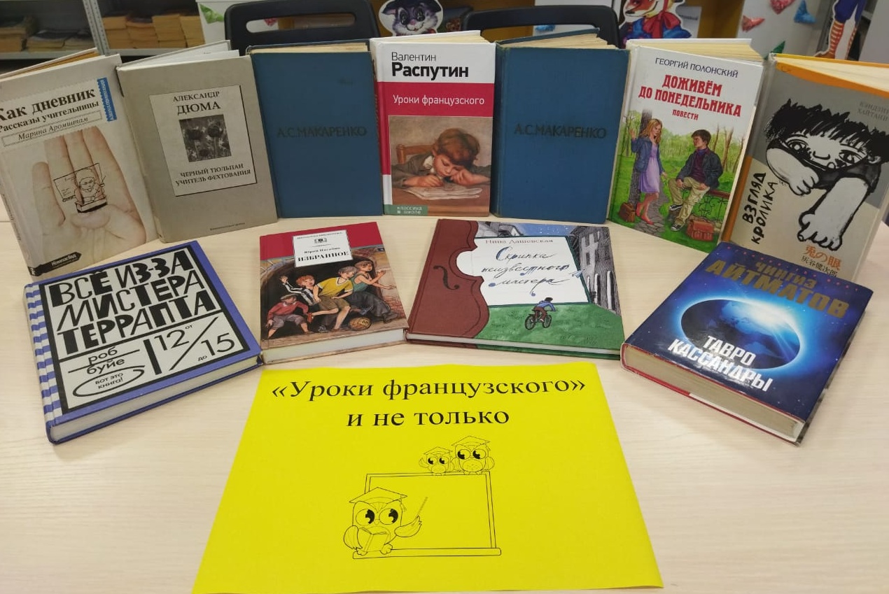 Выставка представляет зарубежные и отечественные художественные произведения об учителях и написанных учителями. Вот некоторые книги русских писателей: «Уроки французского» Валентина Распутина, повествующего о взаимоотношениях внимательной и доброй учительницы к недоедающему, но очень старательному ученику в послевоенное время; «Большая перемена» Георгия Садовникова, имеющая изначальное название «Иду к людям», и прославившаяся благодаря фильму Алексея Коренева про молодого учителя, пытающегося сладить со взрослыми учениками вечерней школы; и, конечно же, «Педагогическая поэма» Антона Макаренко, содержащая описание создания колонии для несовершеннолетних беспризорников и правонарушителей, призванной вернуть их в нормальную общественную жизнь.