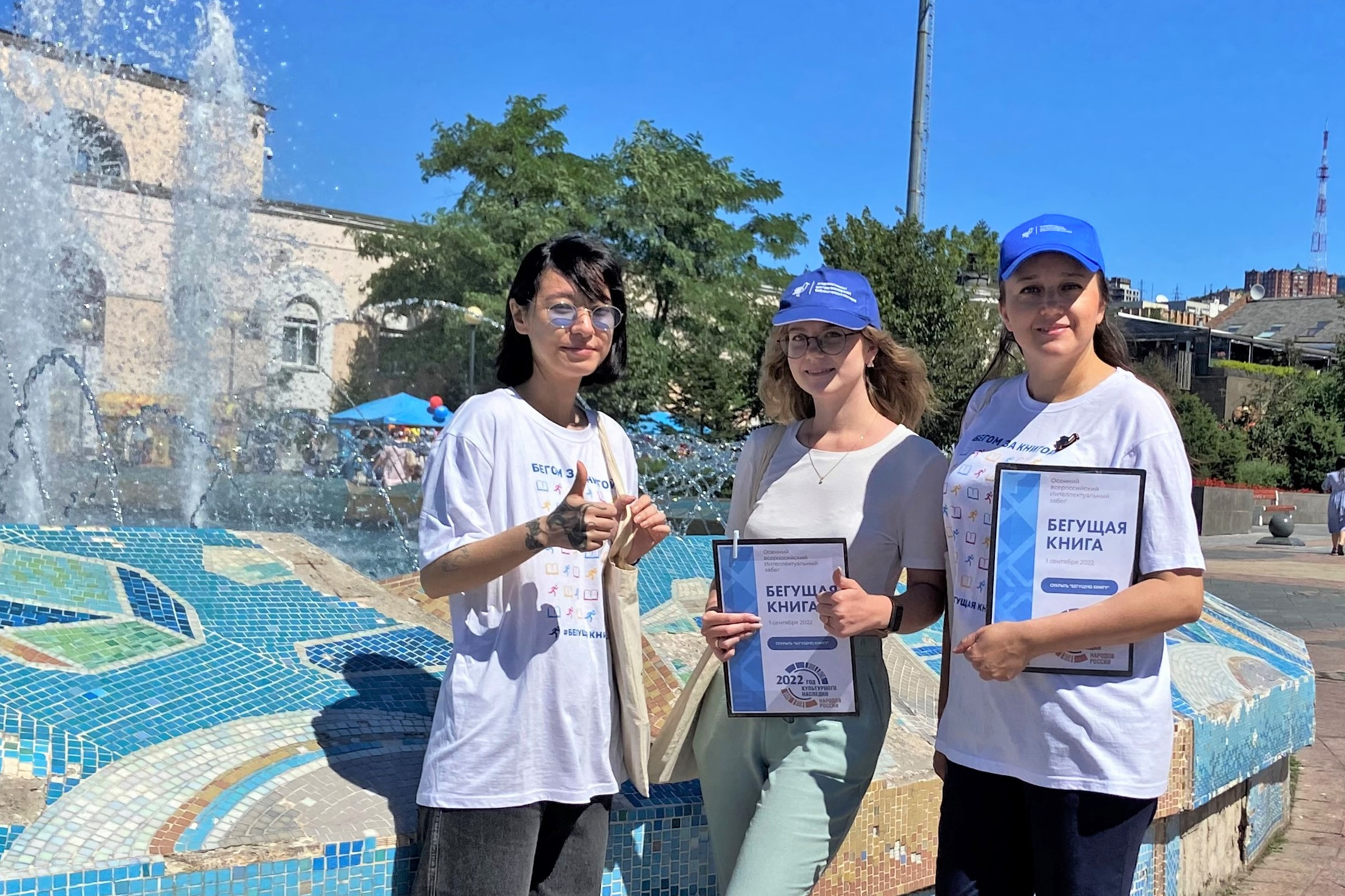 1 сентября библиотекари городской сети библиотек г. Владивостока в очередной раз приняли участие во Всероссийской осенней интеллектуальной акции «Бегущая книга», которая приурочена к Году культурного наследия народов России. В этот раз бежали по Советскому, Ленинскому, Первомайскому районам города. Непосредственные организаторы и участники акции – сотрудники библиотек и волонтёры. «Книгобежцы» развеивают стереотипный образ строгого и педантичного библиотекаря и вновь делают посещение библиотек актуальным и модным занятием.