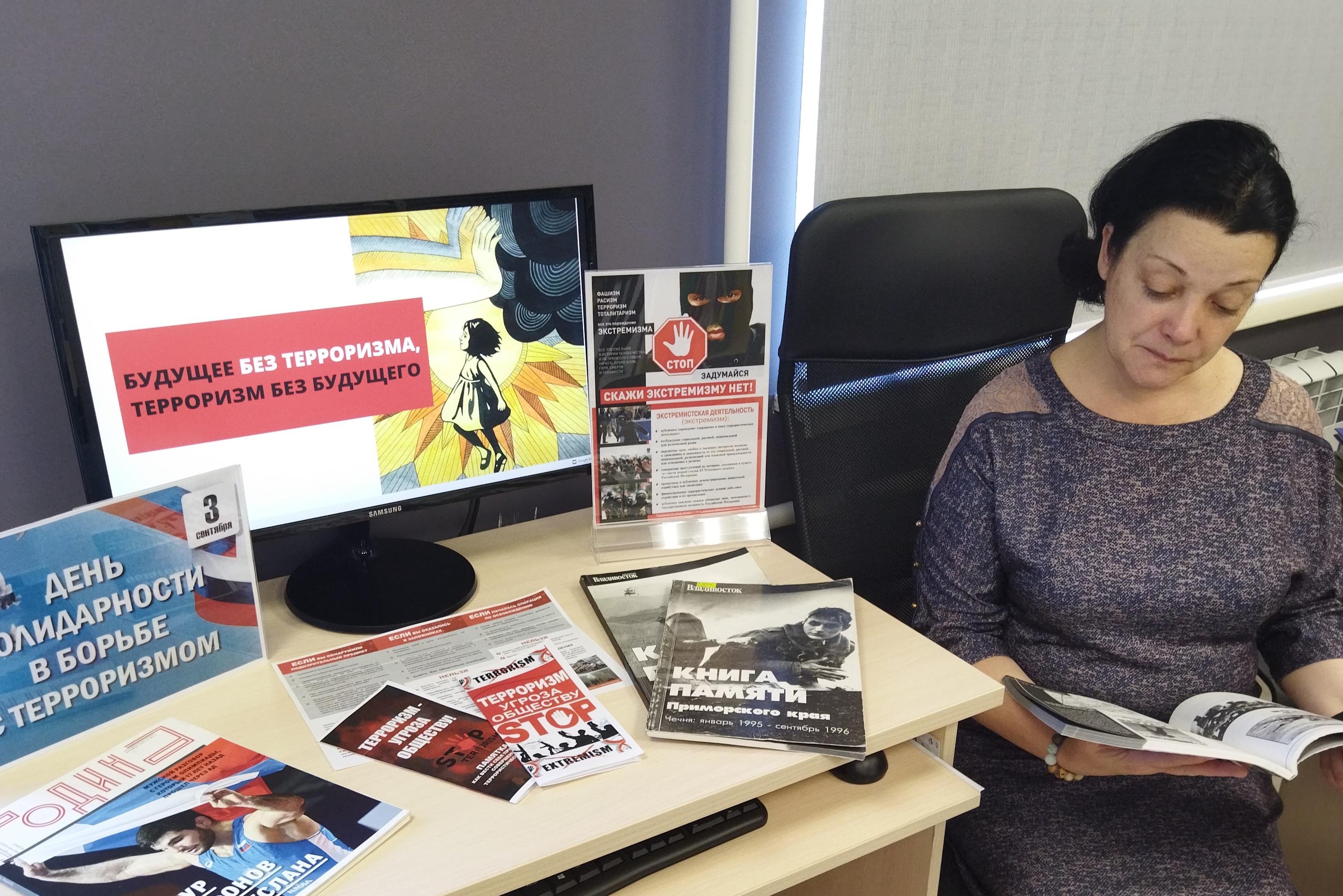 1 — 3 сентября в библиотеках ВЦБС проходили акции и мероприятия ко Дню солидарности борьбы с терроризмом при поддержке Антитеррористической комиссии Приморского края и советника губернатора Приморского края, руководителя аппарата АТК Приморского края Савченко И.В.
