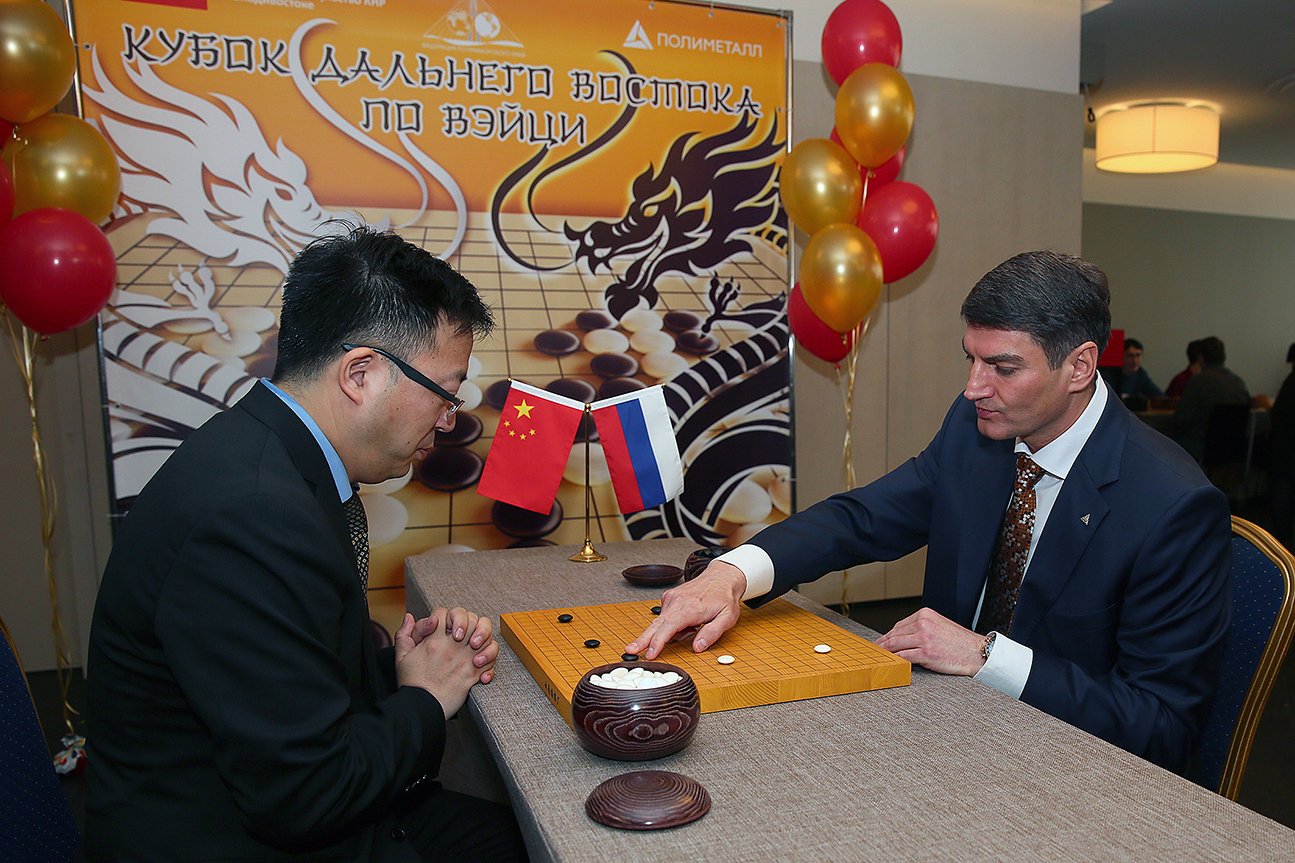 В подготовке текста использован материал Лады Глыбиной «Игры разума», источник — сайт portofranko—vl.ru. На фотографиях президент спортивной федерации Го Приморского края Евгений Сус и Ван Сюечунь, исполняющий обязанности генерального консула КНР во Владивостоке, играют дружескую партию на церемонии открытия Второго турнира на кубок Дальнего Востока по вэйци (Го).